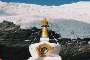 乃钦康桑雪山是西藏四大神山之一,由于高寒,山体顶部尖锥突兀,常年终日白云缭绕,飘撒粒雪,终年累积、压实,形成了厚达20—100米的冰层,冰层受本身重力影响,缓慢移动发育成了多条冰川。卡若拉冰川就在乃钦康桑雪山下,雪白的冰川如一副巨型唐卡挂在山壁上,在阳光的照耀下熠熠生辉。