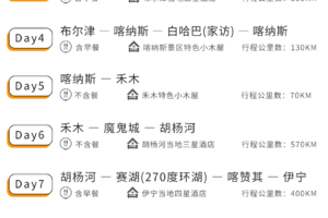 胡杨河市→350KM→赛里木湖(4H)→80KM→薰衣草→喀赞其蓝白小镇→伊宁