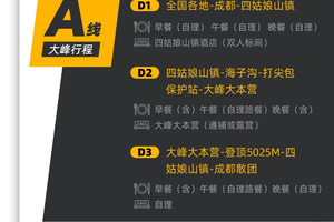 行程内容:当天9:00(以车师傅通知为准)在指定地点集合出发前往四姑娘山镇,其中经都江堰、映秀、卧龙等地。穿过巴郎山隧道抵达四姑娘山镇,一路上可以看到成都平原到川西高原的一个景色变化。