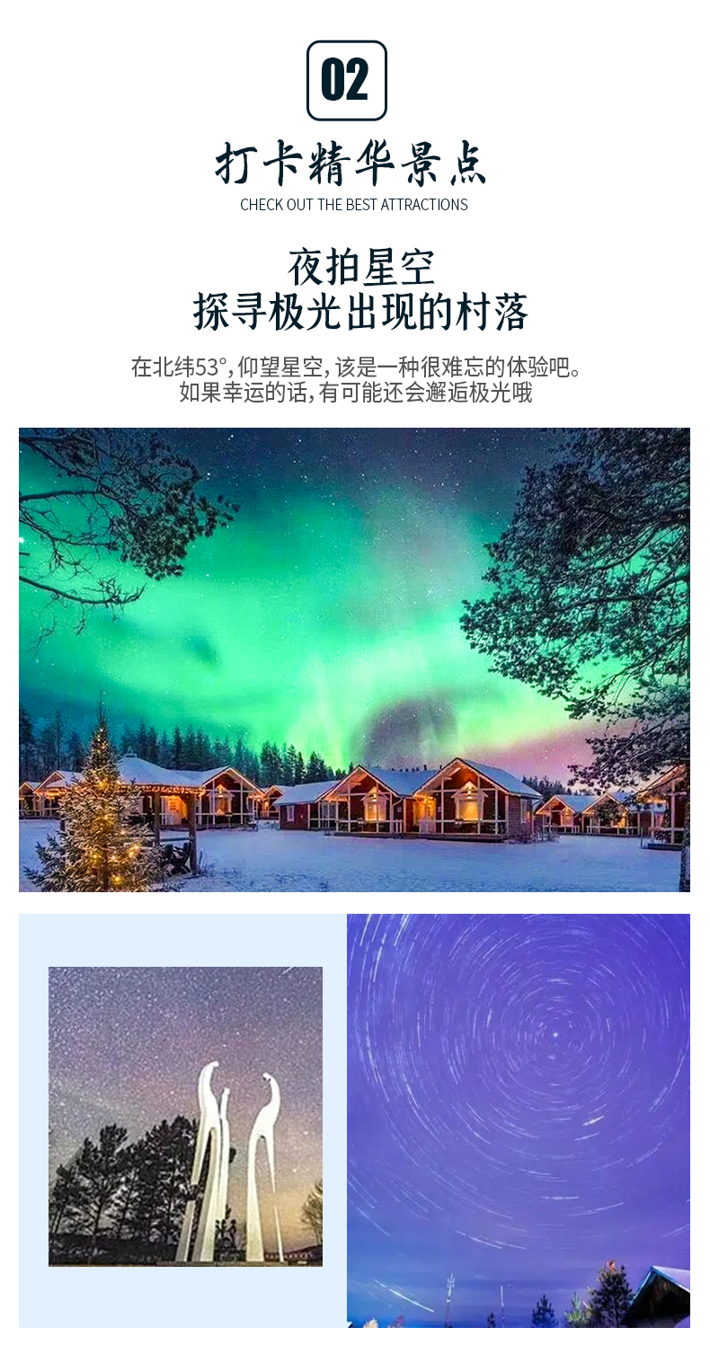 冰上娱乐活动、驯鹿苑、泼水成冰、马拉爬犁、圣诞老人合影、邮寄明信片、寻觅最北点等(不参加无费用退回)