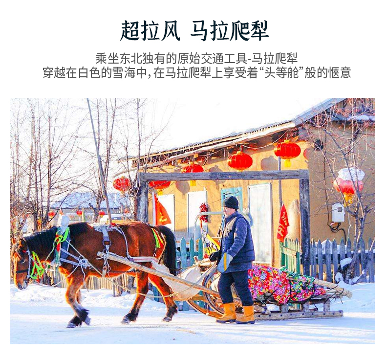 16:00我们会乘坐【马拉爬犁】,在俺们村,马拉爬犁随处可见,这是村民们最喜欢的出行方式,马夫在寒风中唠嗑,盖着棉被的乘客,马拉着爬犁穿过村庄...