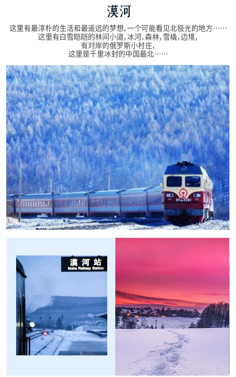 二、火车票:成人包含哈尔滨往返漠河火车卧铺票,(不保证任何车次、时间、席位,以具体出票为准)请集合当天12点之前抵达哈尔滨站,因旺季火车票紧张,建议提前15天以上报名,15天以内报名请现寻客服是否有票。
