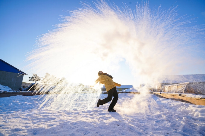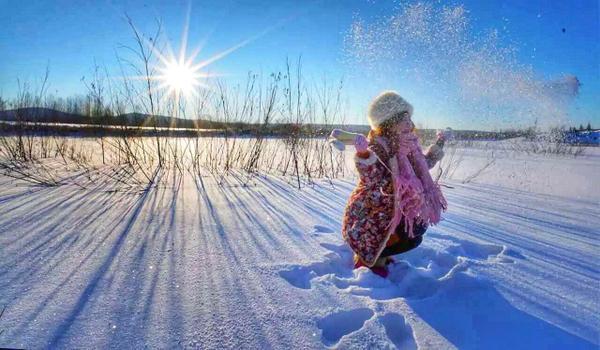 一觉醒来的清晨,站在茫茫雪原看日出,此时迎着朝霞玩一场【泼水成冰】,或者直接躺在在雪被子里撒欢,时间仿佛停止。
