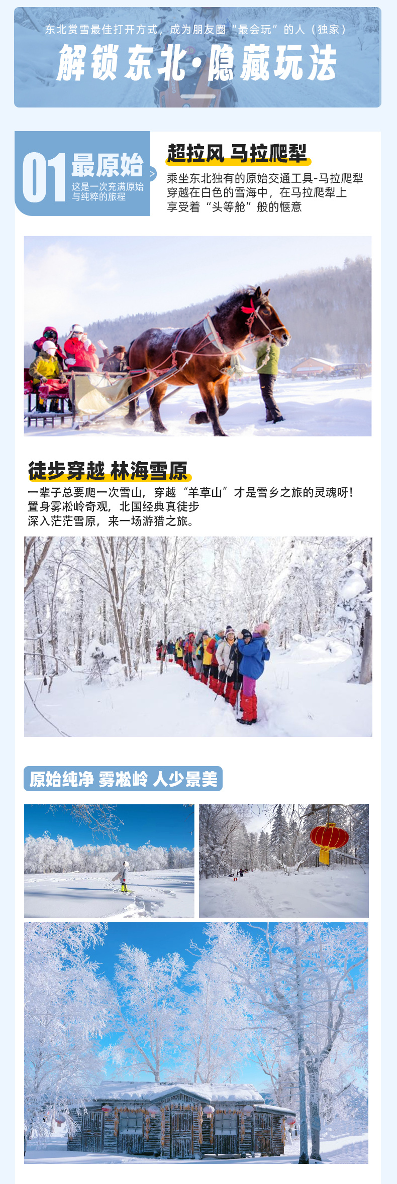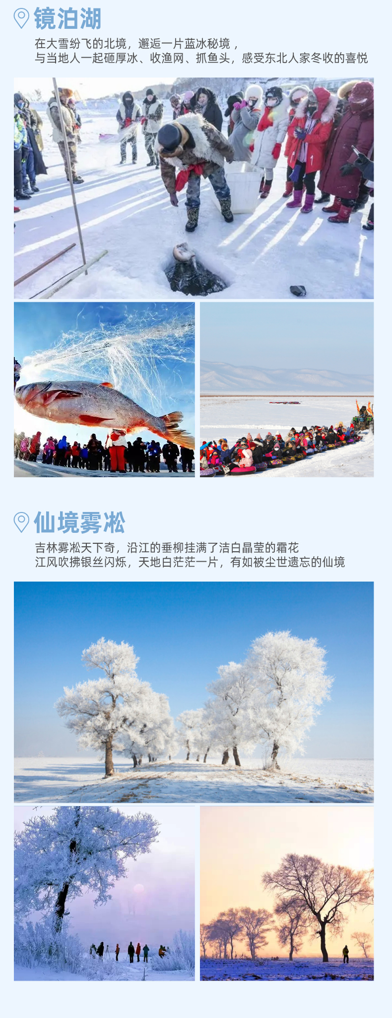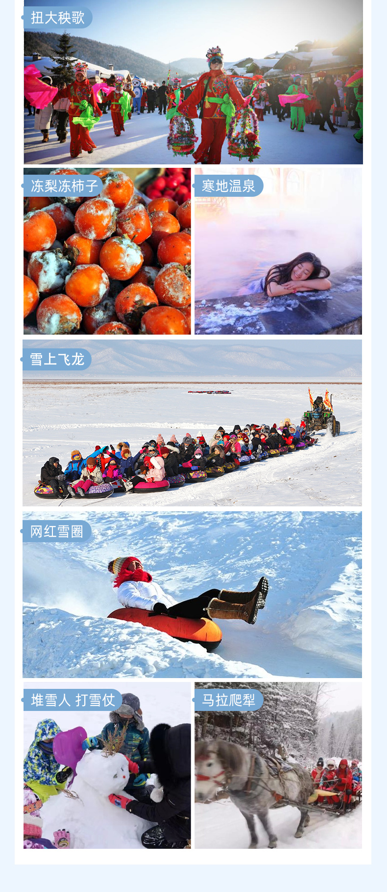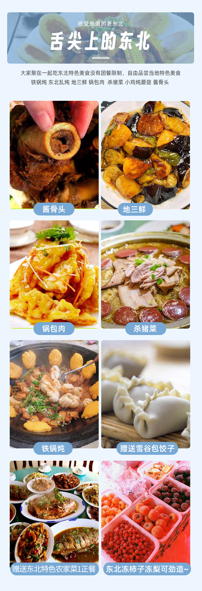 备注:【寒地冬捕】【雪上飞龙】【马拉爬犁】等雪上活动12月中旬冰面封冻体验;如不能玩冰上活动会替换成朝鲜族民俗村。