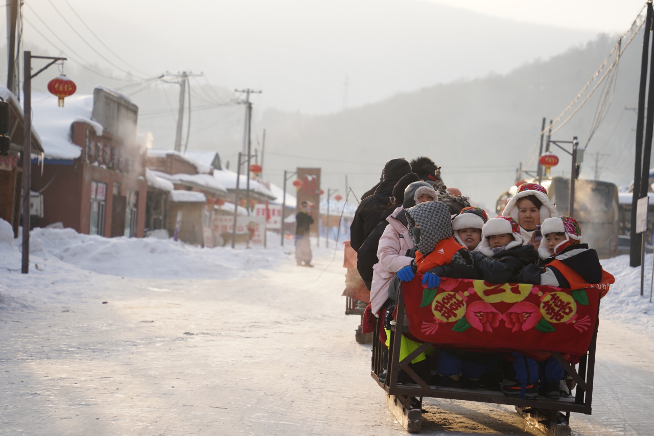 15:00左右一进村,东北气息铺面而来,小平房,大暖炕,烟囱长在房顶上。红灯笼,玉米棒,马拉爬犁确实棒,羊皮袄,狗皮帽,东北老乡火力旺。客栈老板更是天生的幽默,粗犷又真诚的热情让你倍感亲切。