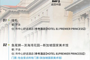 【行程概述】早餐后收拾好行李,如果是下午或晚上的回程机票,可以将行李寄存在酒店,而后自由打卡市区的街道,游览结束后回酒店取好行李,准备返程,提前2个半小时前往机场。我们将送您到樟宜国际机场,至此行程就正式结束了。