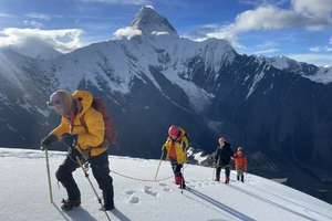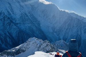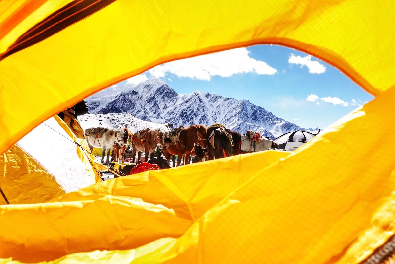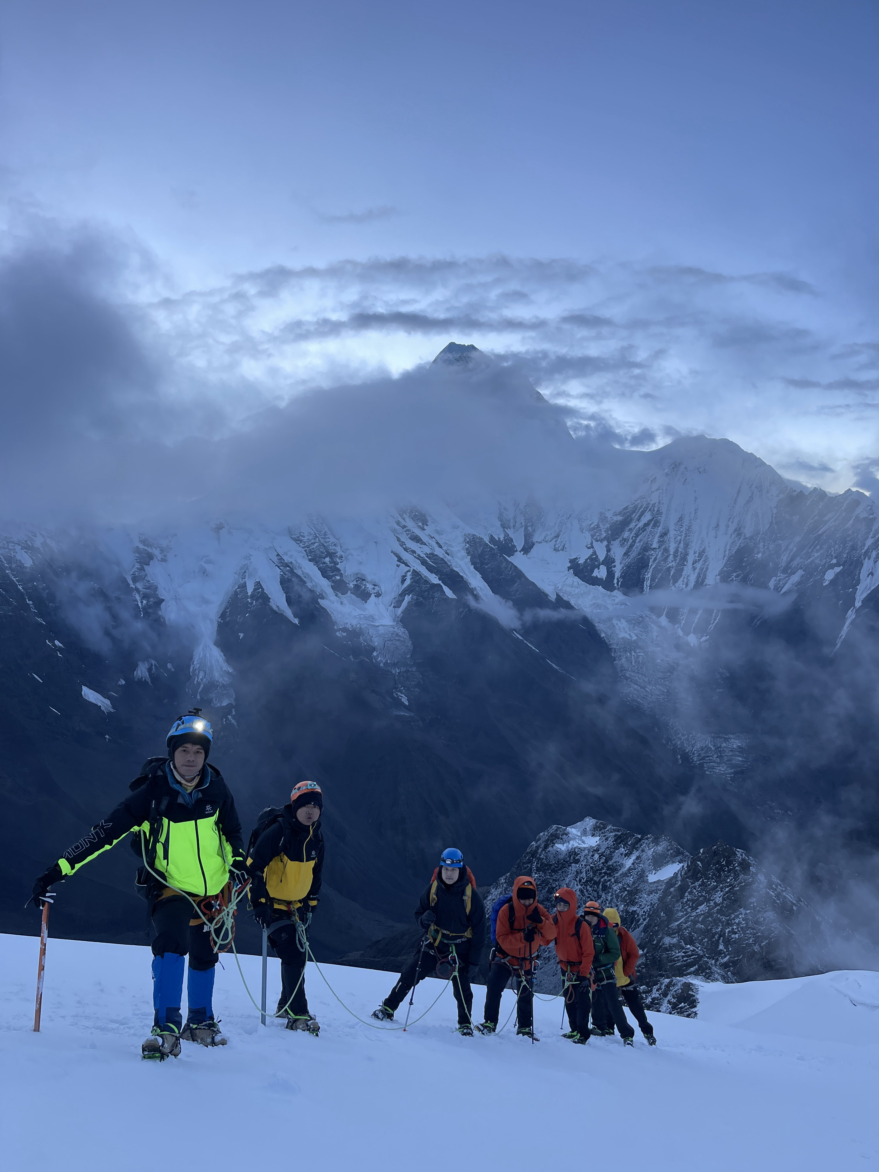 协作会根据当时的气候情况和队员体力确定在凌晨2~3点出发,经过碎石坡到达5200m穿冰爪处,沿路绳到达冰川顶部,登上5588m顶峰,今天攀登全天的景色都非常好,12点之前登顶后返回大本营。继续下撤到子梅村。