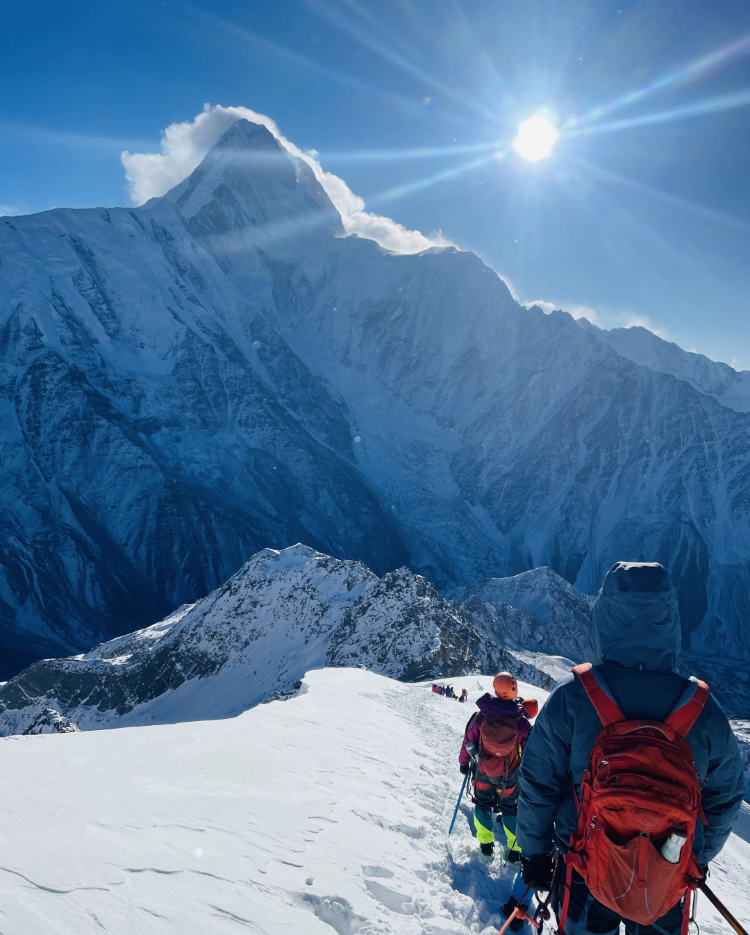 那玛峰进山路线较长,但自徒步开始直到冲顶,全程仅需背负备用衣物、食物、头灯、防晒等;仅冲顶日增加技术装备(安全带(锁、牛尾、下降器)、冰镐、头盔全程佩戴)。