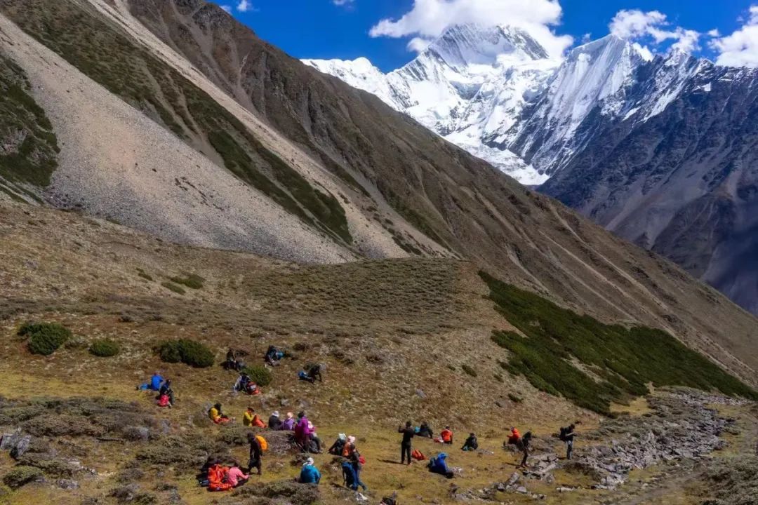 今日早上8:00从下子梅村徒步至贡嘎寺,贡嘎寺位于贡嘎主峰下,是藏传佛教噶玛噶举派(白教)的三大圣地之一,是观赏和拍摄贡嘎雪山主峰的最佳位置。贡嘎寺出发,走冰川河谷路线,沿着贡巴冰川往上走到那玛峰大本营。