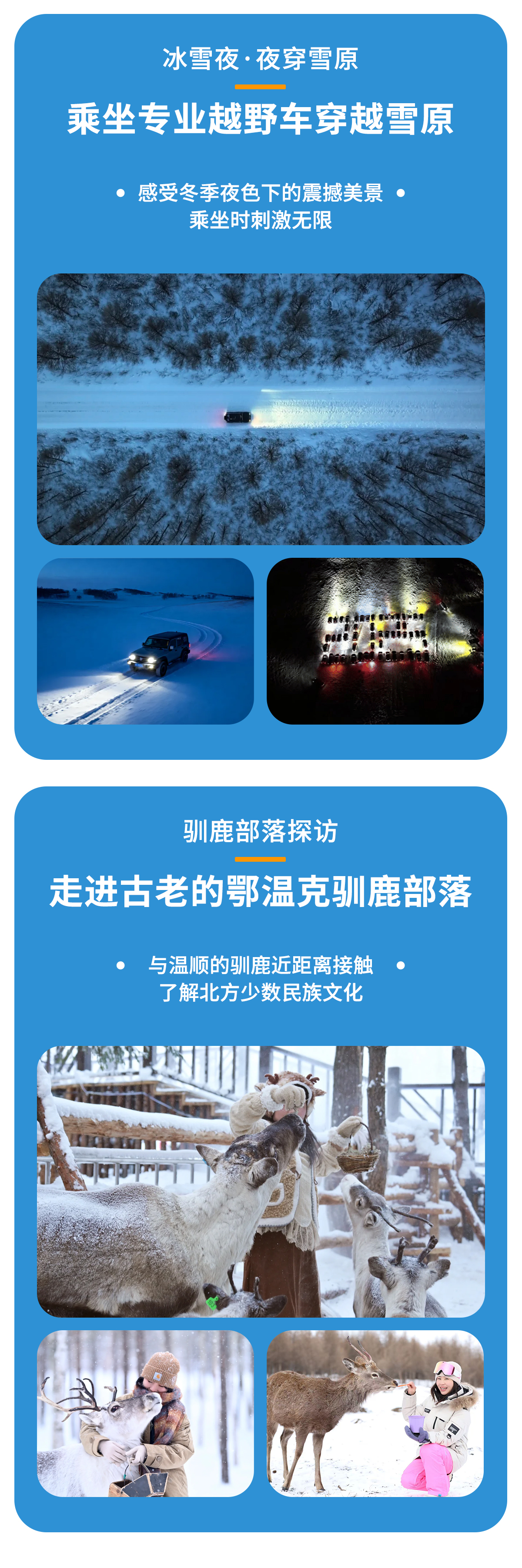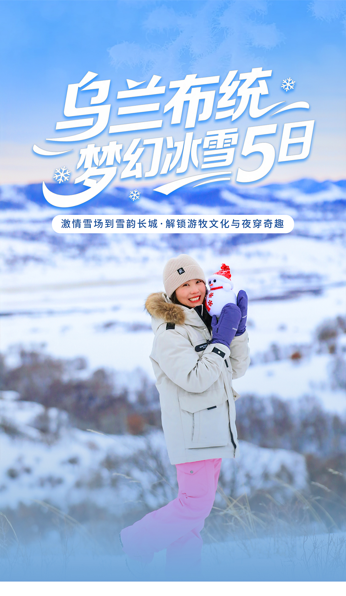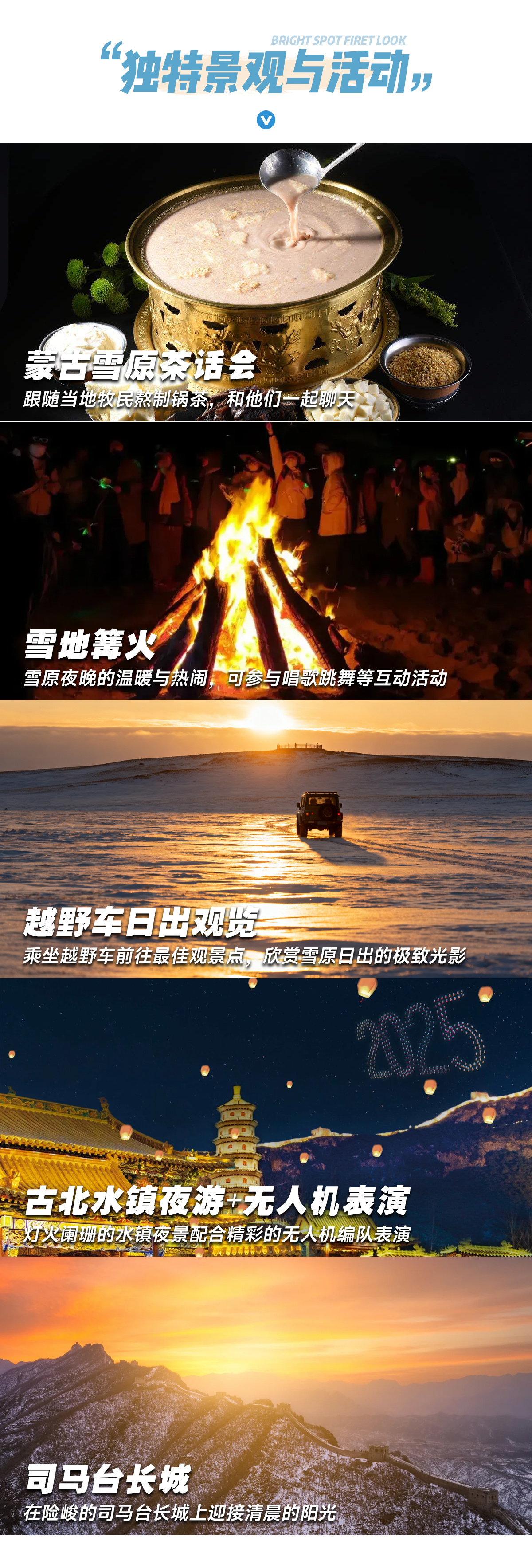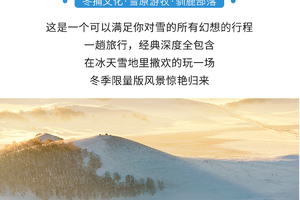 大概下午5点左右到达乌兰布统,大家可以畅快玩雪,打卡拍照,一定注意做好保暖,晚上给大家准备了越野车夜穿(含无人机航拍)、雪地篝火晚会、烟花,尽情享受乌兰布统雪原的浪漫。