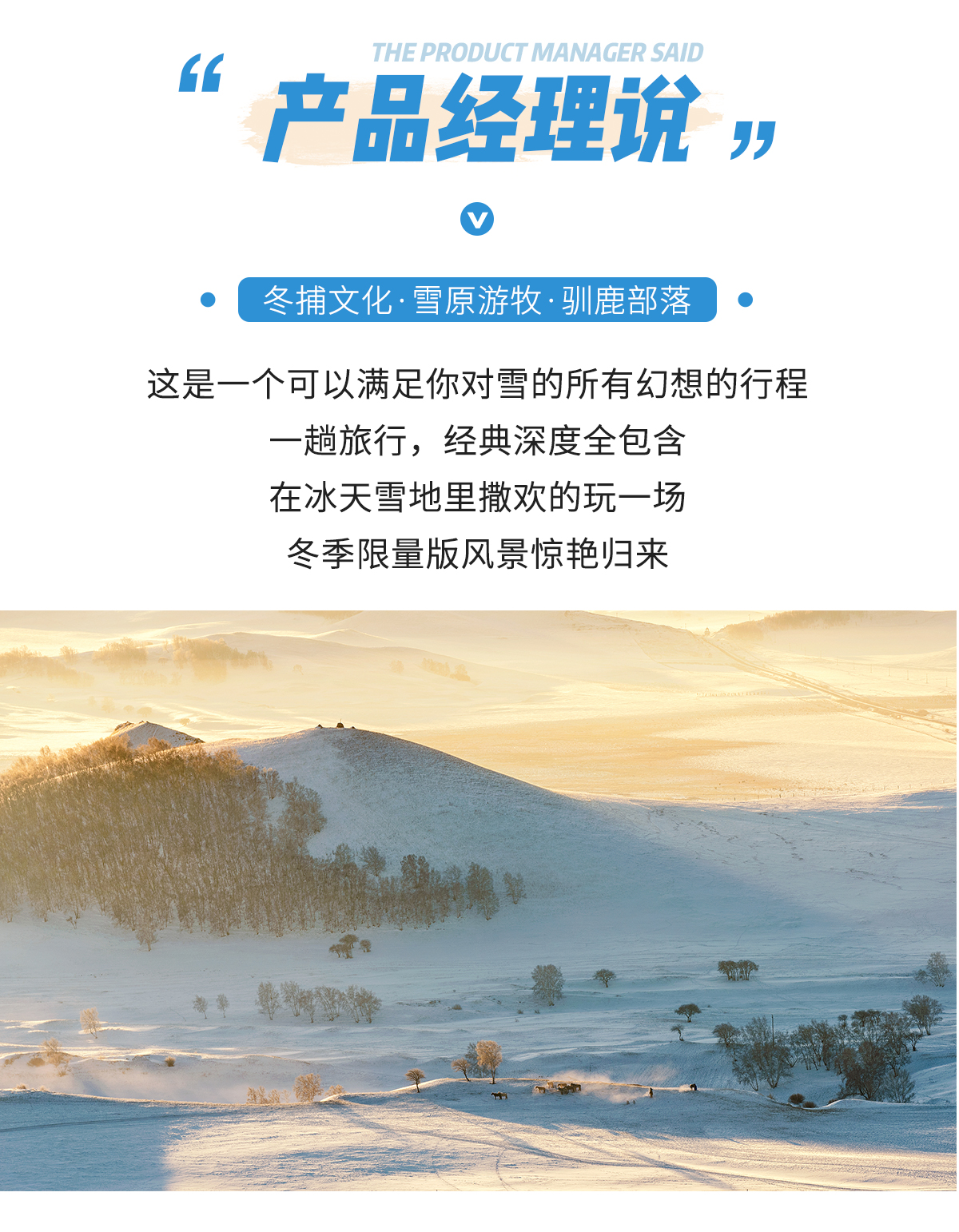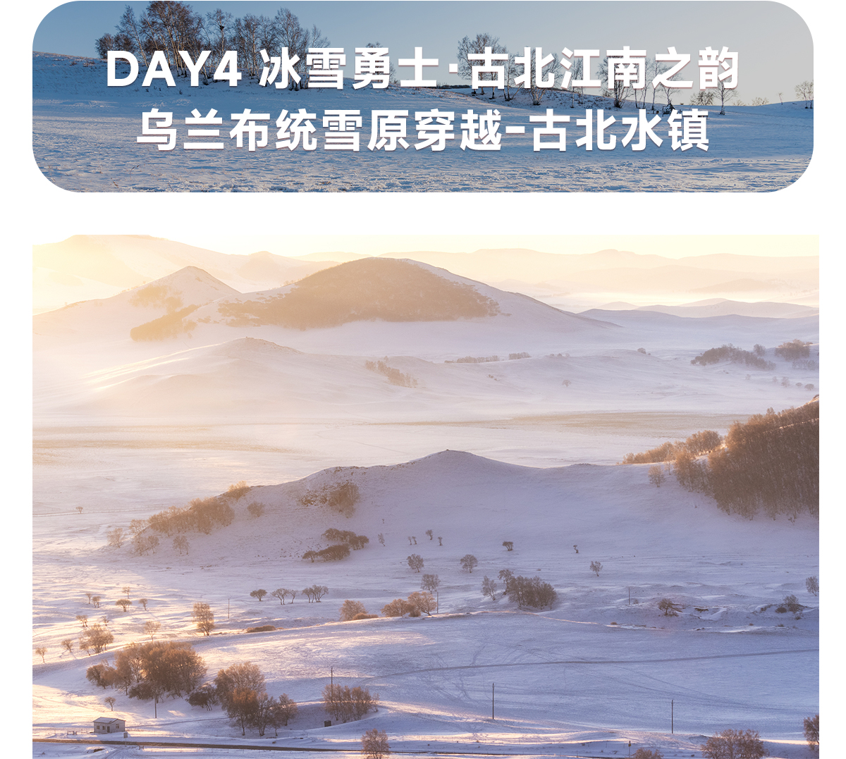 早上:今天大家要早起,乘坐「越野车穿越」雪原,「看草原最美日出」,寻找被遗忘的最美村落。这片雪原腹地,人烟罕至,我们可以在雪原高坡上,玩雪圈,打出溜滑,堆雪人打雪仗;