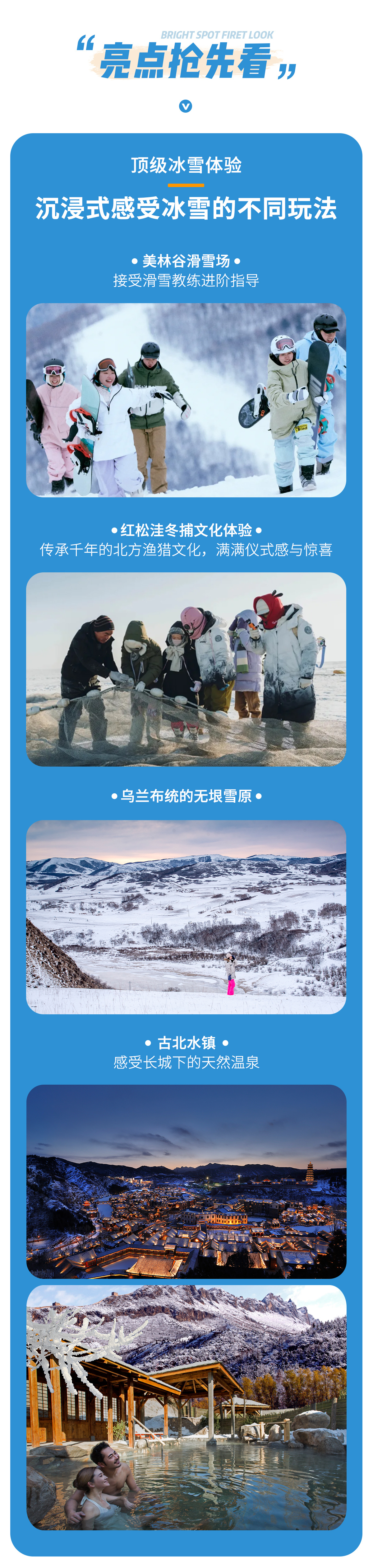 备注:行程所含雪票为初级场,如选择中、高级场自行补齐差价;另滑雪是具有一定风险的体育运动,请根据自身情况理性选择雪道。滑雪票需系统提前出票,不参加不退费,另雪场具体根据情况调整,敬请配合)