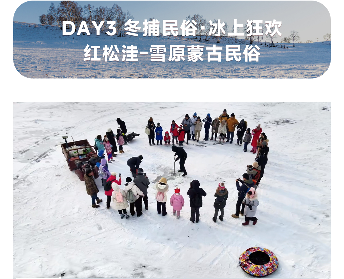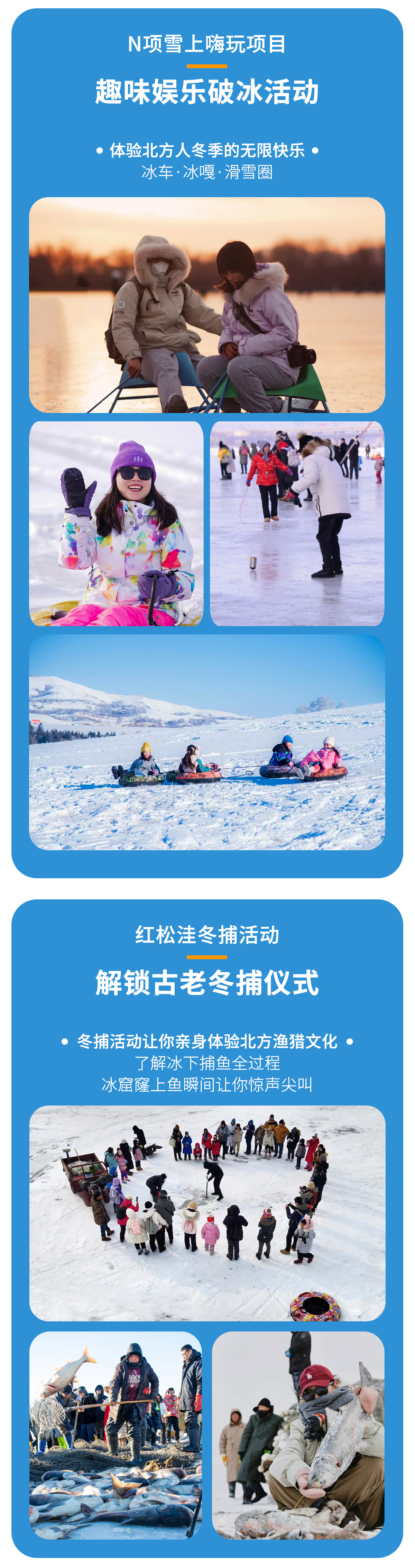 上午:早餐后我们前往【红松洼】体验冬捕活动,在红松洼的冬日画卷里,这份冬季娱乐将“玩雪、赏雪、品雪”融为一体,从民俗体验到冰上狂欢,每一项都藏着独属于雪原的趣味与浪漫,让你沉浸式拥抱冬日美好。