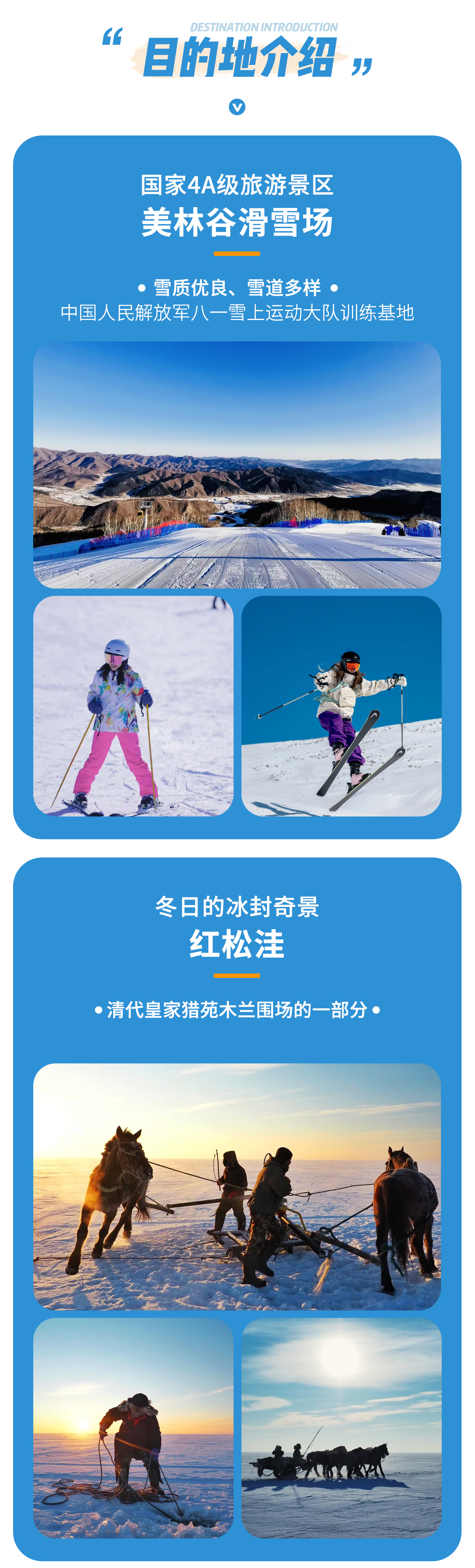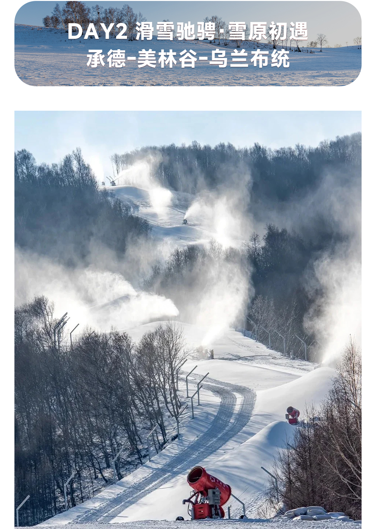 上午:我们早餐后从承德出发,前往【美林谷国际锦标滑雪场】滑雪,这里是国家级滑雪旅游度假地、国家AAAA级旅游景区;