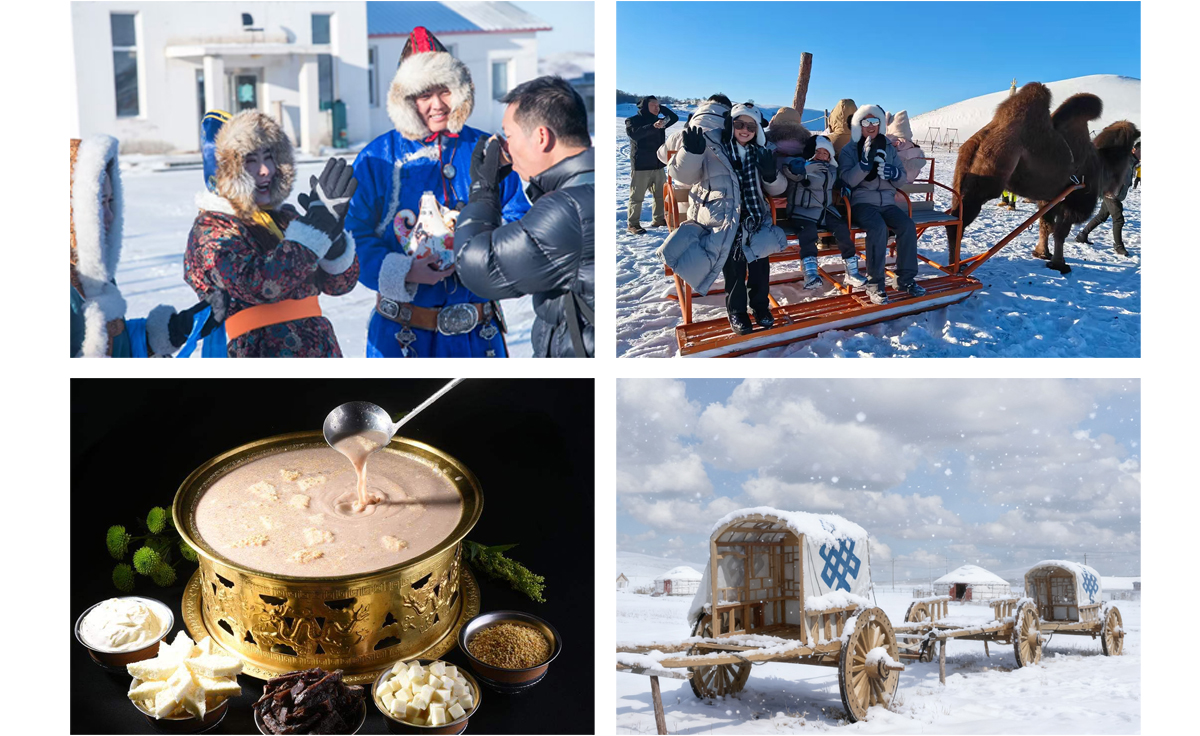 体验「雪地勒勒车」、「雪原迎宾~下马酒」、「骆驼爬犁」、「蒙古雪原茶话会」、「手工制作锅茶」:炒米,奶嚼口,肉干,奶皮子,奶豆腐……