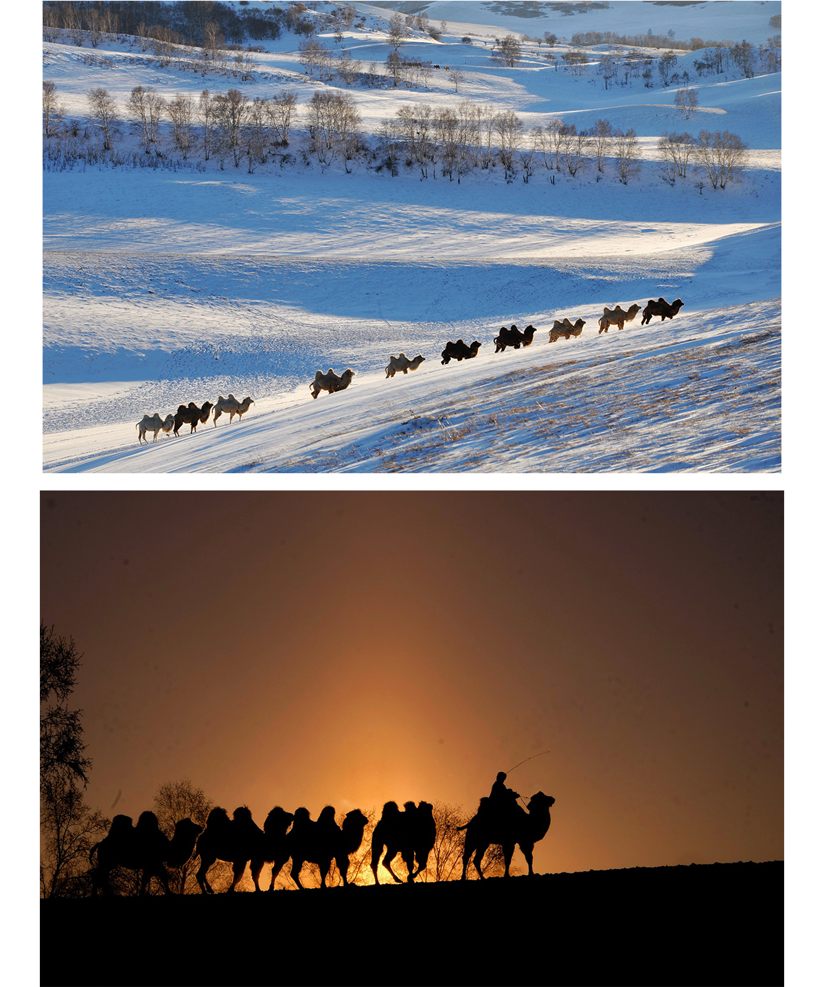 傍晚时分准备了「骆驼奔雪」表演,大家可以拍摄驼队剪影,在日落余晖下非常壮美;
