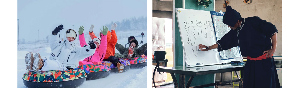 还可以体验「雪上飞碟~滑雪圈」、「蒙语课堂~学蒙语」、「解锁才艺~蒙古舞」;